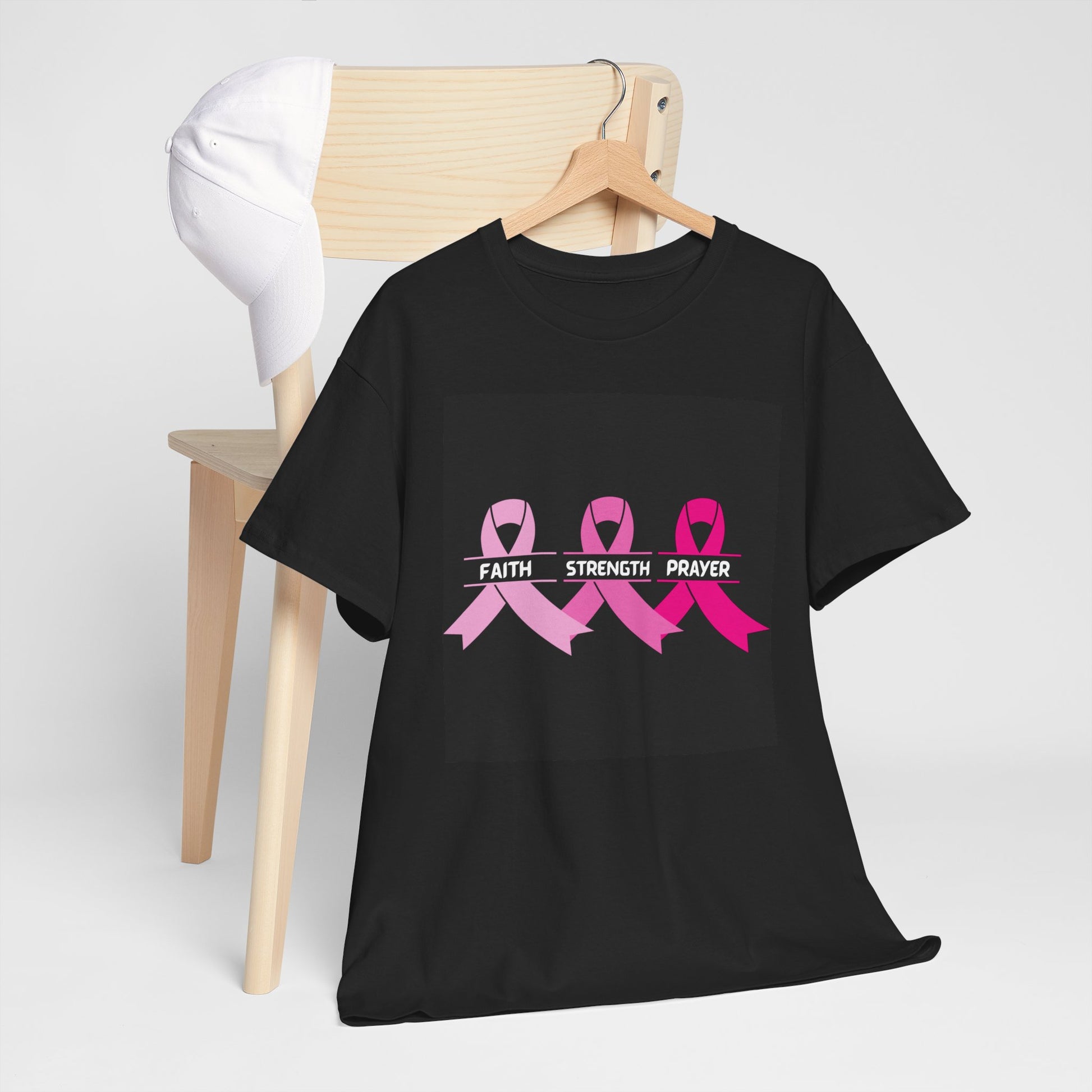 A powerful breast cancer awareness T-shirt for those who want to show support and inspire hope. This tee is perfect for those looking to raise awareness and encourage others to stay strong and keep faith during difficult times. Ideal for those wanting to make a statement and show solidarity with loved ones affected by breast cancer.